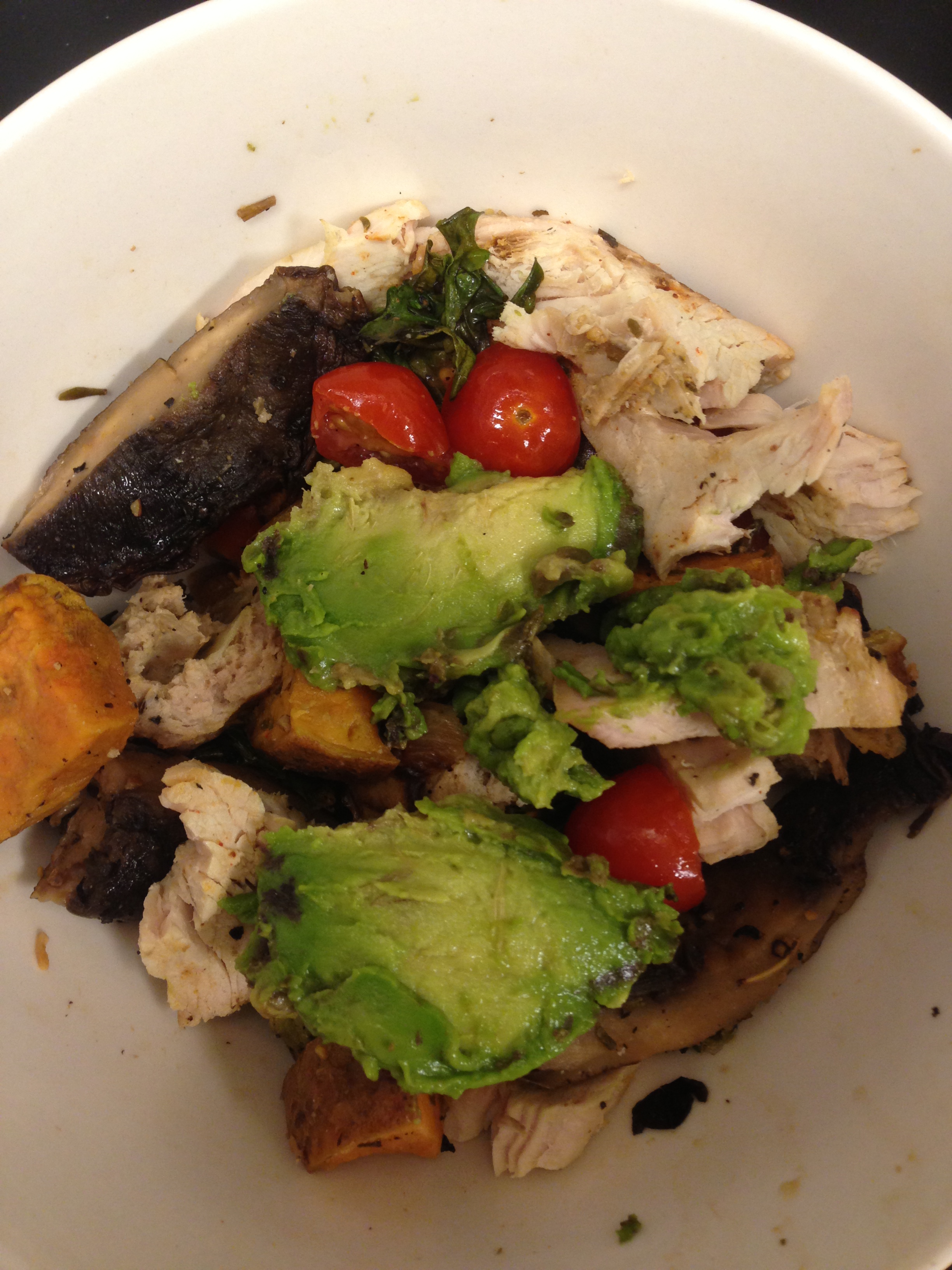 I portioned everything out into 4 tupperware containers and ate them for lunch Tuesday-Friday. As a “dressing” I used a very ripe avocado that I could mash up and stir into the mix.