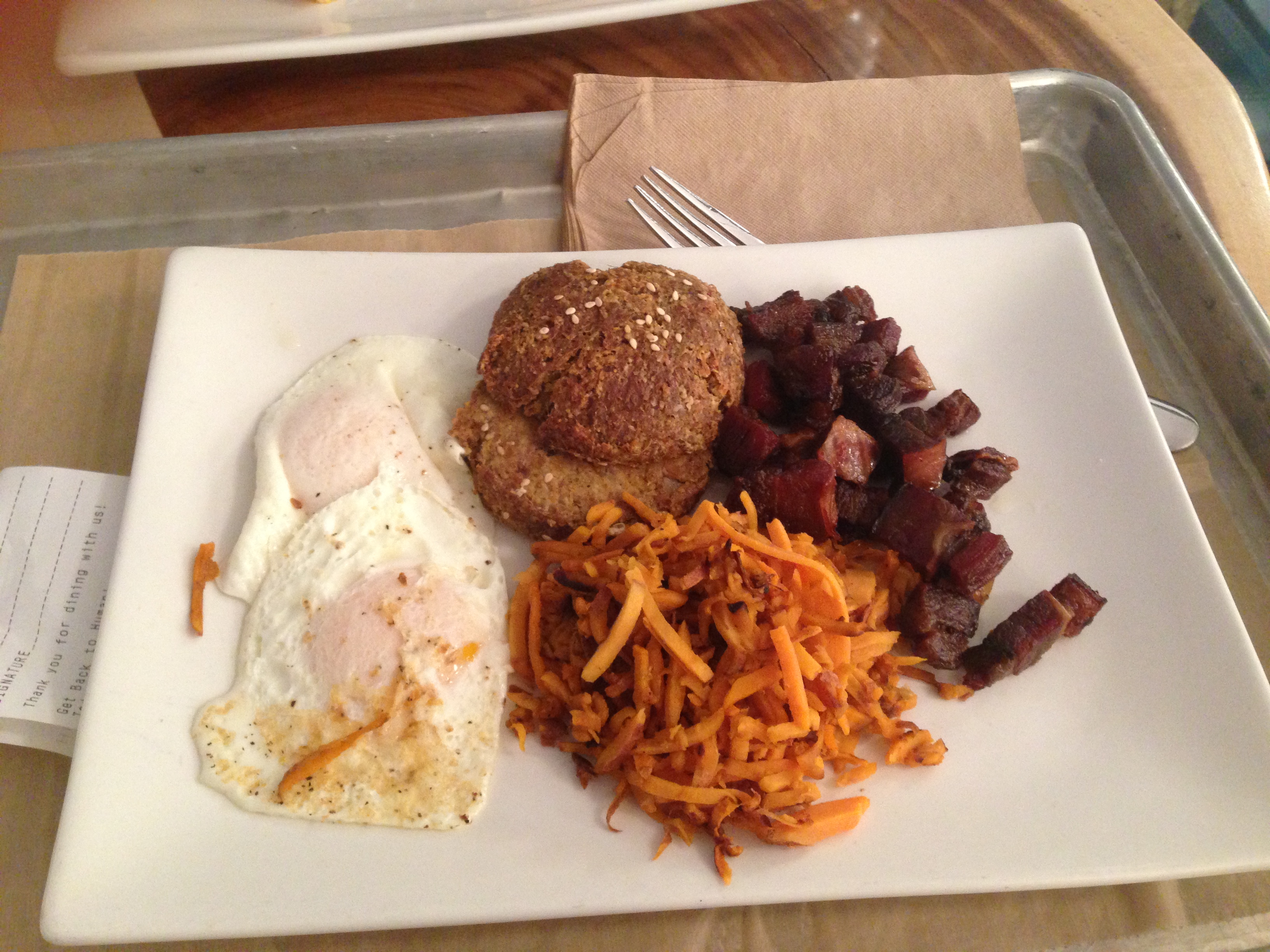 Today I went with two eggs over easy, sweet potato hash and grass fed bacon. Everything is cooked in coconut or olive oil and seasoned with salt and pepper. My meal even came with a biscuit made from veggies, flaxseed and olive oil – how cool is that?