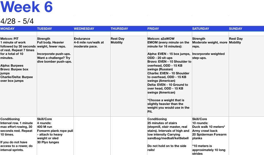 On this page you’ll find a program that we’ve created specifically for those training for the Civilian Military Combine on May 17th. Each week consists of: